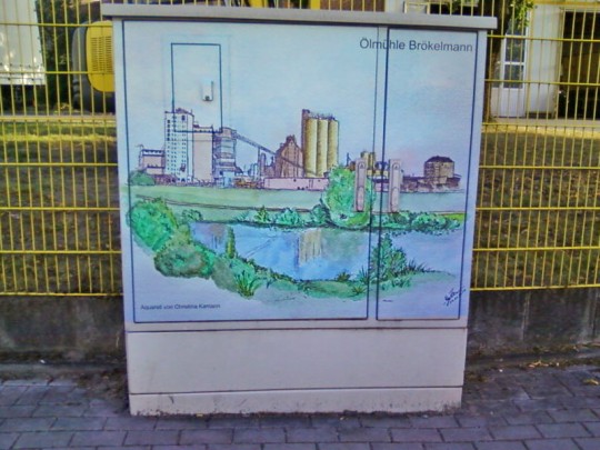 Als Sponsor für die Realisierung des Aquarells als Blickfang auf einem Kasten unweit der Ölmühle im Hammer Hafen war schnell und einfach die Firma Brökelmann selbst gefunden. Gleich zwei Gründe gibt die Firma Brökelmann als Motivation an, den ausgewählten Versorgungskasten an der Kreuzung Radbodstraße/ Ecke Hafenstraße mit diesem Motiv zu verschönern. So möchte das Unternehmen im Rahmen der Aktion „Blickfänge“ einen Beitrag zur Verschönerung unserer Stadt leisten und zugleich ist es den Verantwortlichen auch ein Anliegen, insbesondere die in Hamm lebenden Künstlerinnen und Künstler zu unterstützen und zu fördern.